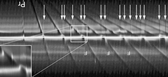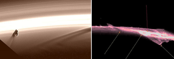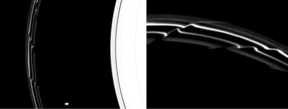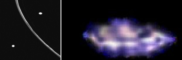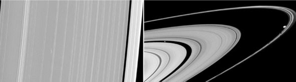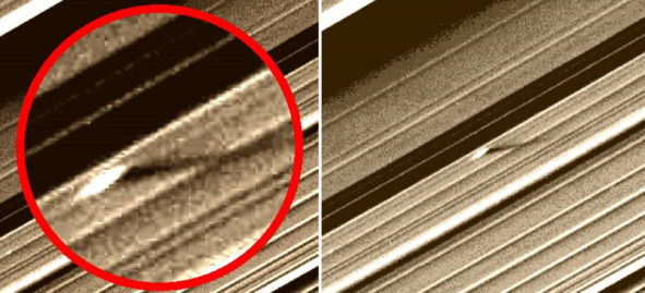 Американцы обнаружили необычные образования на своих фотографиях: «В кольцах Сатурна наблюдаются необычные образования – «спицы», представляющие собой светлые и тёмные полосы, идущие поперёк колец. Впервые спицы были обнаружены еще «Вояджерами». [6] Странно то, что эти полосы ведут себя как единое тело, в то время как кольца Сатурна единым телом не являются. Внутренние слои колец вращаются вокруг планеты быстрее внешних. Ниже, на фотографии слева посредине колец расположены необычные «тени». Эти изображения можно сделать с помощью ткани, которую натянули, например, на колесо велосипеда. Для таких съемок можно использовать и другие приспособления, где тоже есть прямые «стержни».