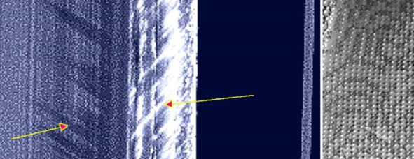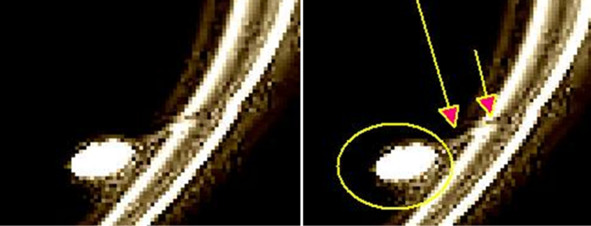 Сам дефект напоминает кусок ткани, который отогнулся вверх. Поэтому освещение сверху дает от этого куска ткани небольшую тень на идеально ровной поверхности ткани. Поверхность «колец» напоминает ткань из стеклянных шариков.