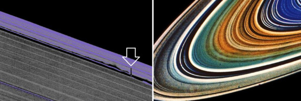 Оказывается, подобные изображения можно было получить с помощью мощных телескопов. Лететь в дальний космос, при этом, необязательно! Но подобные фотографии можно получить так же как это делали в фильме «Солярис». Например, бортовые камеры «Вояджеров» показали, что с близкого расстояния кольца Сатурна похожи на граммофонную пластинку. На пластинку можно нанести краску различных цветов. Фотографии колец, подписи: «Слабые цветовые различия между кольцами Сатурна, отражающие их разный химический состав, на этом изображении усилены. Состав главных колец – водяной лёд (около 99%) с примесями силикатной пыли. Толщина колец чрезвычайно мала и составляет порядка десяти метров». [6]