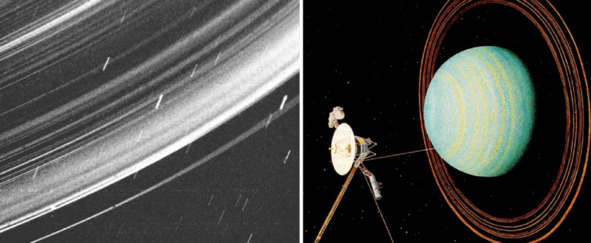 Фотоматериалы, связанные с деятельностью «Вояджера-2», тоже содержали много интересных моментов. Подпись под фотографией, слева: «Телекамера «Вояджера-2» зафиксировала облик кольцевой системы Урана. Короткие светлые полоски – следы движения звезд за время 96-секундой экспозиции. Снимок сделан с расстояния 236 000 км с разрешением 33 км». [6] Подпись под изображением, справа: «Вояджер-2» – единственный аппарат, исследовавший Уран с близкого расстояния. Над тарелкой антенны, направленной на Землю, платформа с телекамерами». [6] Интересно было бы узнать, каким образом, на непрозрачной полосе «колец» «Урана» проявились «звезды»? Почему во время такой длительной экспозиции резкость изображения указанных «колец» была очень хорошей? Изображение справа является, несомненно, рисунком художника. Но этот рисунок очень похож на «фотографии» планеты. Кадры мультипликационного, нарисованного фильма, в которых Уран изображен ярко голубым, не убеждают в реальности этой «миссии».
