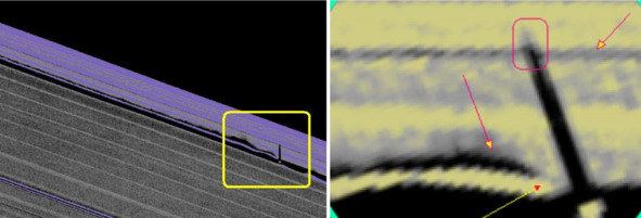 Все это оканчивается приспособлением в виде серпа (короткая желтая стрелка). Приспособление «обслуживает» обруч и предназначено для сборки и ремонта секций обруча. Американская халатность и здесь могла привести к нежелательным последствиям. Ниже на левом снимке изображена ситуация: незаконченное кольцо с разрывом, который отмечен квадратом.