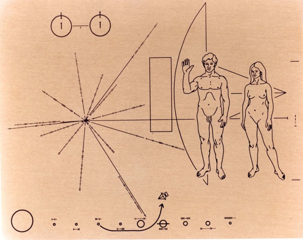 Сказочникам НАСА нужны были деньги не только из бюджета США, которые, на самом деле, тратились на личные нужды организаторов обмана. Они хотели получать деньги от рекламы этого «события». Поэтому была придумана сенсация. Оказывается, мистификаторы знали с самого начала, что эта станция США полетит к зеленым человечкам, к инопланетянам и снабдили, якобы, этот аппарат золотой пластинкой с обнаженными фигурами мужчины и женщины. Космическая порнография!