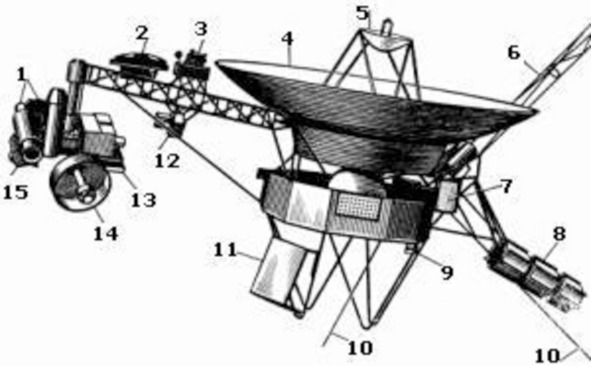 К слову американцы признали, что АМС «Пионер-10» с письмом для инопланетян не мог выйти за пределы Солнечной системы: «Первым в истории аппаратом, достигшим границ Солнечной системы и вышедшим за её пределы, стал «Вояджер-1»В 1977 году в космос были запущены зонды «Вояджер-1» и «Вояджер-2», на борту которых, помимо научной аппаратуры, находятся послания для инопланетян. На золотых пластинах указаны координаты Солнечной системы, а также записаны земные изображения и звуки. Для прослушивания последних, не обязательно быть инопланетянином, и обладать специальным устройством, ведь NASA решило выложить эти звуки в свободный доступ». [1] Ниже общая схема американской АМС для «полета» в дальний космос.