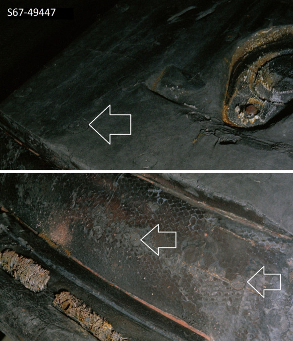 В процессе после приводнения капсулы «Аполлон-4» наблюдается необычная картина, со странными «узорами» на боковой поверхности «КМ». Необходимо отметить такой момент, что справа внизу следы от двух круглых, скорее всего, металлических конструкций, не являются следствием работы двигателей торможения. Сопла этих двигателей блестят. Следы идеальной, правильной, круглой формы обжига расположены сверху и снизу от сопел. Если бы РДТТ выбрасывали раскаленный газ и нагревали вокруг себя поверхность капсулы, то сопла попали бы в средину тёмного пятна. При этом на поверхности капсулы не могли появиться идеальные круги обжига. Ни одного кусочка синего покрытия, которое было на старте на этом объекте не обнаруживается. Аналогичную картину можно видеть на еще одном снимке из Архива НАСА. Это момент, когда капсулу подняли на борт корабля. Несомненно, это один и тот же «КМ». Стрелками отмечены аномалии, которые не должны были появиться.