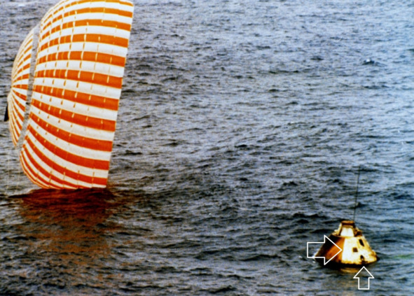 На фотографии из архива НАСА есть изображение КМ «Аполлон» сделанные сразу же после приводнения на воду с использованием одного парашюта. В дальнейшем их станет три. Стрелками отмечены те места аномальных проявлений «аэродинамического нагрева». Отпечаток круглой формы от нагревания и прямая линия, граница между обгорелой и не обгорелой частью КМ, на снимке [7] наглядно показаны.