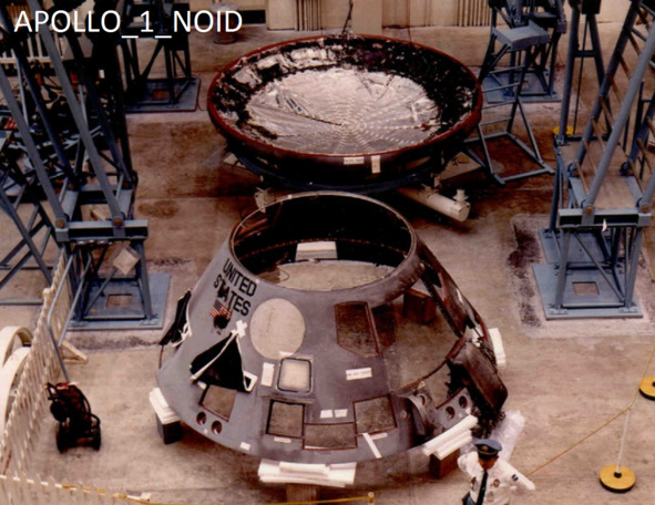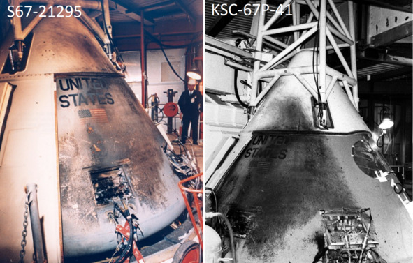 Следующие фотографии НАСА S67—21295, KSC-67P-41. [9], [10] наглядно демонстрируют с разных сторон отсутствие каких-либо трещин на поверхности Командного модуля «Аполлон-1». Как этот «свидетель», так и аналогичные «очевидцы, которые рассказывают о трещине на поверхности капсулы, говорили неправду. Они или не были на самом деле никакими свидетелями, а их просто заставили дать именно такие показания. Есть вероятность того, что эти «очевидцы» были соучастниками.