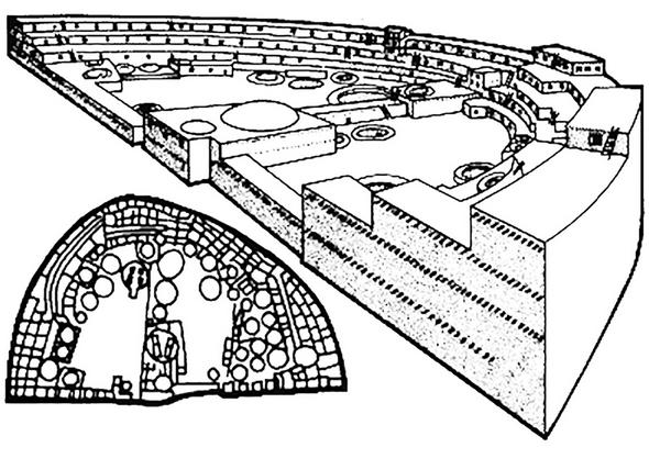 Рис. 1.45. Pueblo Bonito, Chaco Canyon, New Mexico, около 1070 AD. a. Реконструкция, b. Руины жилой части комплекса.