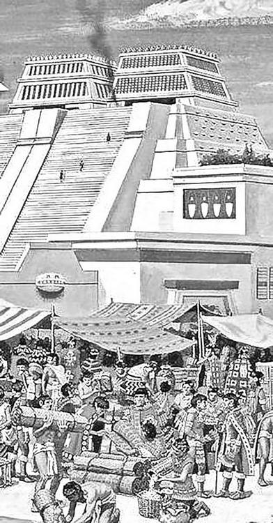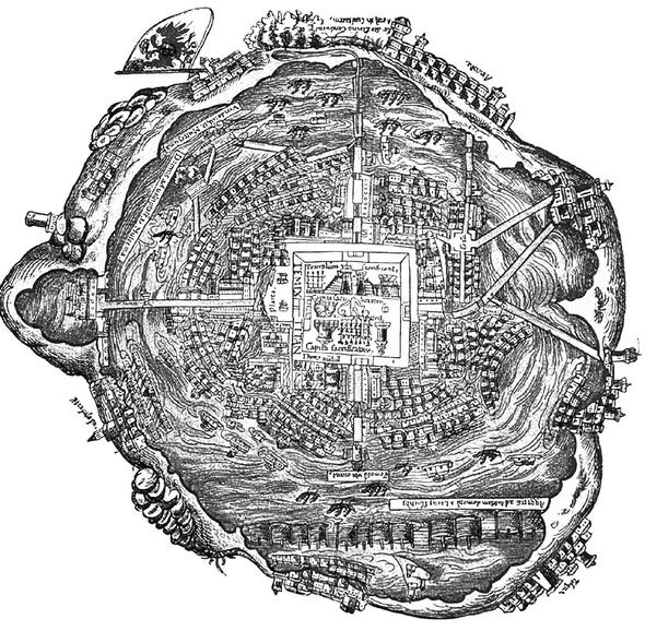 Город размещался на островах посреди озера Texcoco и занимал территорию около 13 квадратных километров. По оценке Кортеса, его население составляло около 200 тысяч, превышая почти все современные столицы Европы. Связь с побережьем осуществлялась по дамбам с подъемными мостами, пропускающими корабли и изолирующими город в случае военной угрозы (Рис. 1.42.а.).
