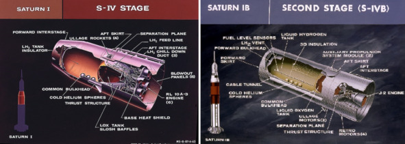 На рисунках схематически показаны: слева ступень S-IV и справа ступень S-IVB. А «сестры» очень похожи! Вот результаты этого полета (1): «Последняя ступень (ракета S-4B) экспериментальной ракеты-носителя „Сатурн IБ“ SA-203 выведена на орбиту с не полностью израсходованным топливом. Основные задачи запуска – изучение поведения жидкого водорода в состоянии невесомости, испытания системы, обеспечивающей повторное включение основного двигателя ступени. После проведения запланированных экспериментов в системе отвода паров водорода из бака были закрыты клапаны, и в результате повышения давления ступень взорвалась на седьмом витке». Кроме того, 20 января 1967 года взорвалась при наземных испытаниях та самая ступень S-IVB, которую готовили для изделия «Сатурн-5» серийный номер №503. Мифология НАСА, информация для размышления: «Целью полета AS-203 было исследование поведения в невесомости горючего – жидкого водорода во второй ступени S-IVB-200. Эту ступень Сатурна-1Б планировалось испытать в данном полете на предмет включения-выключения на орбите вокруг Земли, так как в лунных экспедициях она будет третьей ступенью Сатурна-5 (в варианте S-IVB-500) и для старта к Луне с космическим кораблём Аполлон её двигатель должен повторно запускаться на опорной орбите. Для обеспечения запуска двигателя в невесомости были приняты меры по управлению положением жидкого водорода в баке горючего. Чтобы иметь на орбите необходимое количество топлива в баках второй ступени, пришлось отказаться от полезной нагрузки – был установлен только головной обтекатель».
