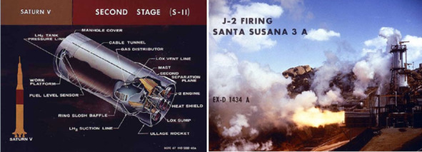 Это значит, что для запуска станции «Скайлеб» совсем не обязательно было иметь «водородные» технологии. Керосина, как видите, вполне достаточно. Выше, на схеме слева: вторая «водородная» ступень S-II. А был ли мальчик? Фотография справа: А пламя-то явно не водородное. Больше похоже на работу керосинового двигателя. Кстати, есть забавное фото прожига ЖРД J-2 на стенде. Его ярко желто-оранжевое пламя столь не похоже на бледно-голубоватое свечение настоящих водородников Шаттла типа ЖРД SSME, что моим смущениям нет числа. Между прочим, абляционное охлаждение там на J-2 официально не применялось, так что причин для подкрашивания пламени какой-нибудь сажей быть не должно. Чистый водород!