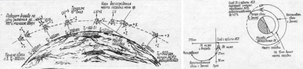 Вверху, слева, представлена схема имитации посадки на Луну в исполнении «Аполлон-10». Справа расположена схема снижение лунного корабля Apollo-10 до высоты 15 км над поверхностью Луны. Рисунки из книги «ракетчика» Шунейко И. И.