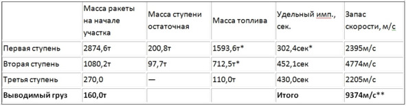 * – Учет пакетной схемы: данные по первой ступени соответствуют участку совместной работы обоих ступеней; данные по 2 ступени даны с учетом выработки топлива на 1 участке.