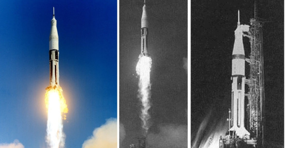 Важно понимать следующее: ракетный блок S-IVB является третьей ступенью самой главной ракеты всей программы – «Сатурн-5», а водородный ЖРД J-2 – двигателями второй и третьей ступени «Сатурн-5». Одним словом, ракетный двигатель J-2 – это краеугольный камень всей лунной темы. Уберешь его, и вся лунная пирамида развалится. Премьера «Сатурн-1Б» состоялась 26 февраля 1966 г. Опять суборбитальный полет! Поднявшись на высоту 488 км, сей объект приземлился в Атлантике. На сайте НАСА пишут, что целью миссии AS-201 было испытание прототипа корабля «Apollo» и проверка его спускаемого аппарата на управляемый вход в атмосферу. Технические писатели НАСА пишут, что полет был в целом удачным. Хотя не обошлось и без «досадных мелочей». Корабль «Аполлон» при спуске на Землю потерял управление по крену, вошел в режим неуправляемой закрутки и с дикими перегрузками в несколько десятков единиц G плюхнулся в океан. На фотографиях, расположенных внизу изображен с разных направлений съемки первый запуск РН «Сатурн-1Б», который состоялся 26.02.1966 года.