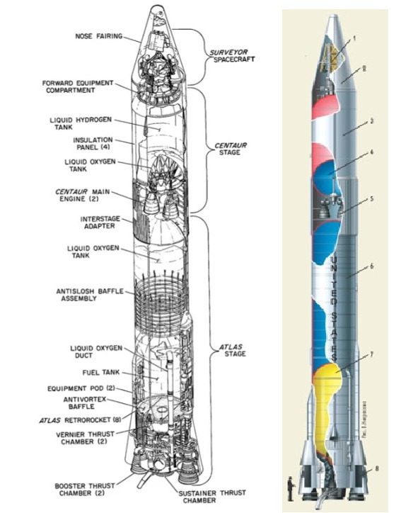 11 августа 1965 г. стартовал АС-6, несущий макет «Surveyor SD-2» при однократном включении «Центавра». Впервые почти за 2 года РН «Atlas-Centaur» достигла полного успеха. Двигатели «Центавра», работавшие в течение 435 сек, вывели SD-2 на орбиту наклонением 28.6°, высотой 166х815085 км и периодом обращения 31 день. Апогей лежал вдвое дальше, чем орбита Луны. Полет доказал, что носитель «Atlas-Centaur» был, наконец, готов исполнить «прямой» запуск (однократное включение ЖРД верхней ступени): после серии неудач АС-10 запустил «Surveyor 1», который выполнил первую в США мягкую посадку на Луну 2 июня 1966 г. Далее схема ракета-носителя «Atlas-Centaur», которая, якобы, доставила американские АМС на Луну.