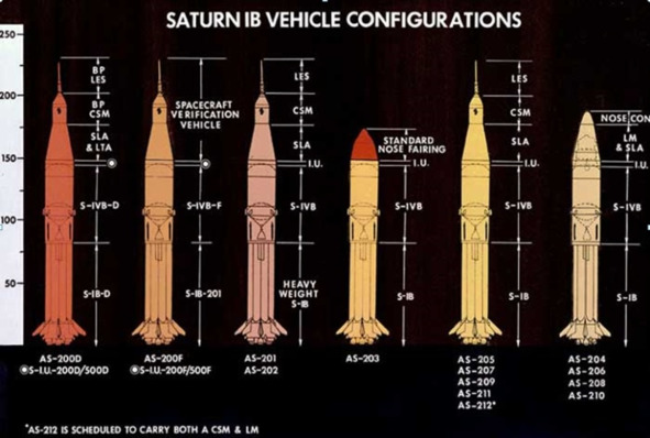 А главное, в ракете вместо водородных двигателей RL-10 появился неведомый до этого времени водородный ракетный двигатель J-2 тягой ~105 т. Неведомым этот двигатель был потому, что летных испытаний он не проходил. Только стендовые, наземные испытания. Американцы более слабый жидкостный ракетный двигатель (ЖРД) RL-10 (в 16 раз!), не могли довести до ума, так подавай им сразу 100-тонник! На рисунке внизу: схема различных конфигураций ракеты «Сатурн-1Б».