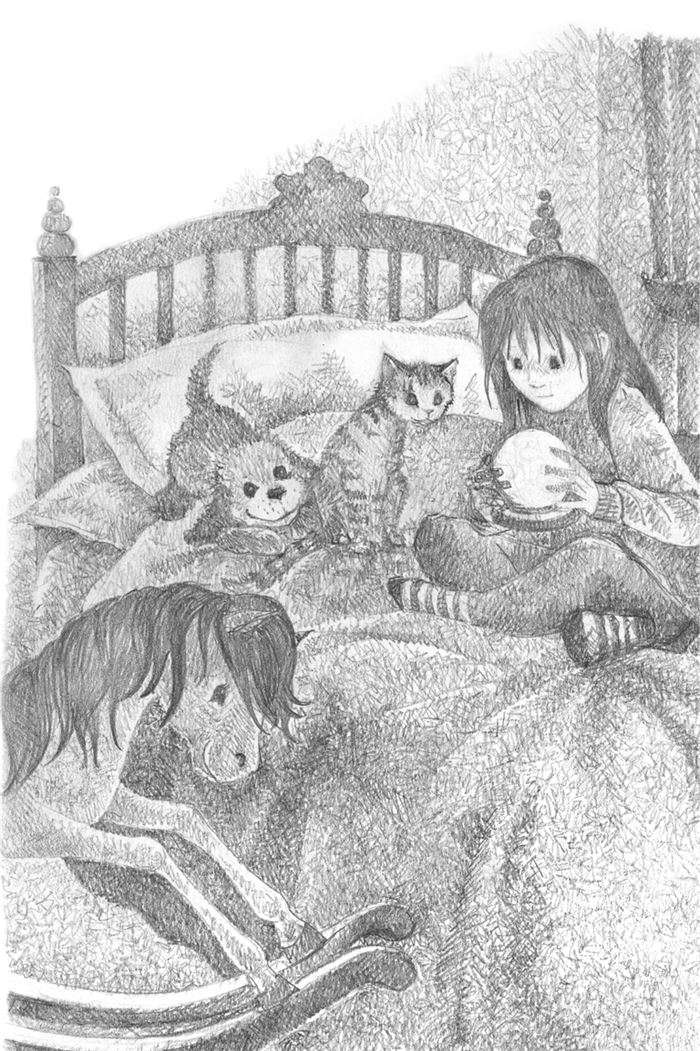Люси сидела в комнате на кровати, скрестив ноги, вместе со своей маленькой кошечкой Мэри, Растрёпой и Роки – конём-качалкой.