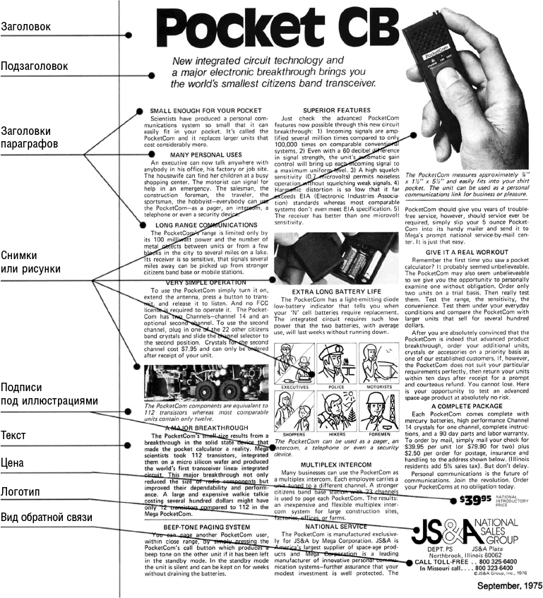 Чтобы ознакомиться с идеей данной аксиомы, давайте рассмотрим рекламу си-би-рации, которую мы размещали в 1975–1977 гг. Она содержит все элементы, которые можно ожидать увидеть в крупноформатном рекламном объявлении. И чтобы мои слушатели поняли аксиому, я обычно прошу их определить, какова роль каждого из 10 графических элементов в объявлении. Вот к чему мы обычно в конце концов приходим: