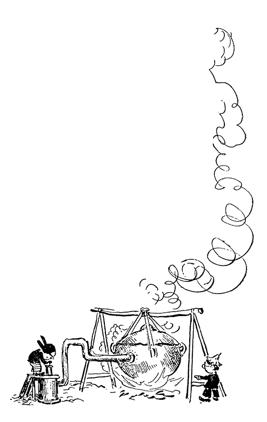 Пока вокруг спорили, Знайка велел развести посреди двора костёр, и все увидели, как Винтик и Шпунтик вынесли из своей мастерской большой медный котёл и поставили его на костёр. Этот котёл Винтик и Шпунтик уже давно сделали для нагревания воздуха. Котёл был с наглухо закрытой крышкой, в которой имелось отверстие. Сбоку был приделан насос для накачивания в котёл воздуха. Этот воздух нагревался в котле и уже горячий выходил через верхнее отверстие в крышке.