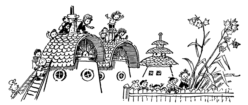 Ещё не было шести часов утра, а вокруг уже собрался почти весь город. Многие коротышки, которым хотелось посмотреть на полёт, сидели на заборах, на крышах домов.