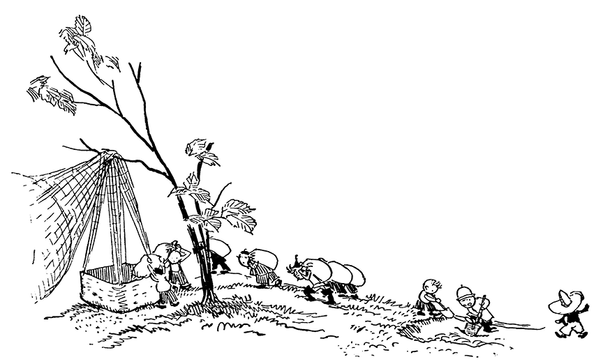 Но шар не улетел, так как корзина была крепко привязана к ореховому кусту. Она только немного приподнялась над землёй.