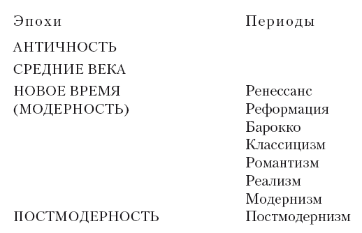Постмодерн в самом общем смысле – это четвертая большая эпоха в истории западного человечества, которая следует за Новым временем. Термин «постмодерное» требует прояснения в связи с тем, какое историческое содержание вкладывается в понятие «модерное». Здесь необходимо провести различие между (1) «модерностью» – в европейских языках этим термином обозначается вся эпоха Нового времени (Modernity) – и (2) «модернизмом» (Modernism), который является последним, завершающим периодом Нового времени (более частные деления внутри модернизма включают символизм, футуризм, сюрреализм, экзистенциализм и т. д.). Соответственно следует различать между (1) «постмодерностью», большой, многовековой эпохой, следующей после Нового времени, и (2) «постмодернизмом», первым периодом постмодерности, который следует за модернизмом, последним периодом Нового времени.