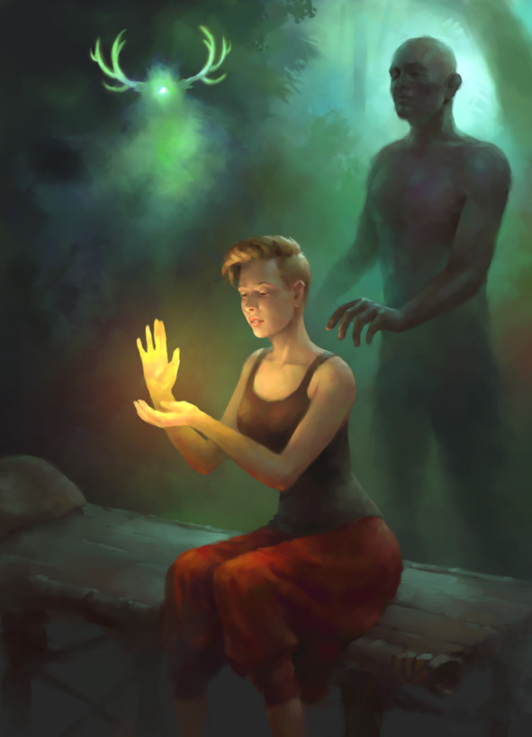 Примерно через полчаса я поняла, что пространство вокруг меня меняется, лес начал двигаться, листва деревьев – сплетаться в текучий орнамент. Я с интересом наблюдала за этими изменениями из гамака, как вдруг увидела в отдалении в листве глаз, который смотрел прямо на меня. Сфокусировала своё внимание на этом глазу, постепенно начали проявляться и другие детали: нос, длинный, широкий, ветвистые оленьи рога и улыбка. Это определённо была улыбка.