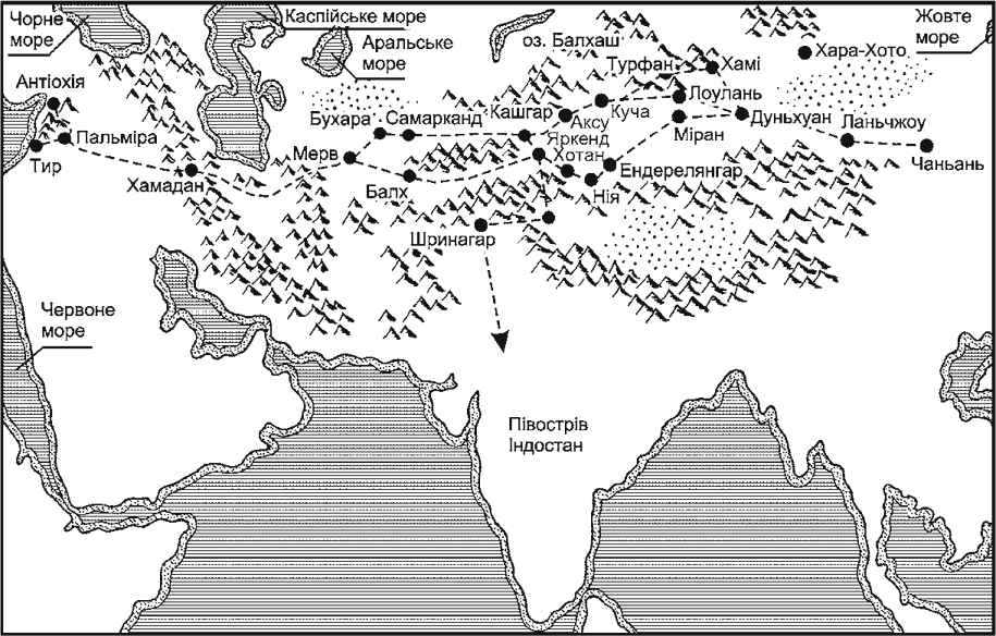 Погляньте на карту, і ви побачите, яким довгим був Великий шовковий шлях. Він простягнувся від міста Сіань на річці Вейхе до Ланьчжоу на Хуанхе, потім до Ганчжоу. Перед пустелею Такла-Макан шлях роздвоювався – одне його розгалуження обходило пустелю з півночі, друге – з півдня. Вони з’єднувалися в Кашґарі, а потім знову розходилися. Можна було через Ош і Андижан потрапити у Ферґанську долину, з якої неважко дістатися Персії, Малої Азії, Європи. А на південь від Кашґара, через Памір, пряма дорога вела в Срінагар та Індію.