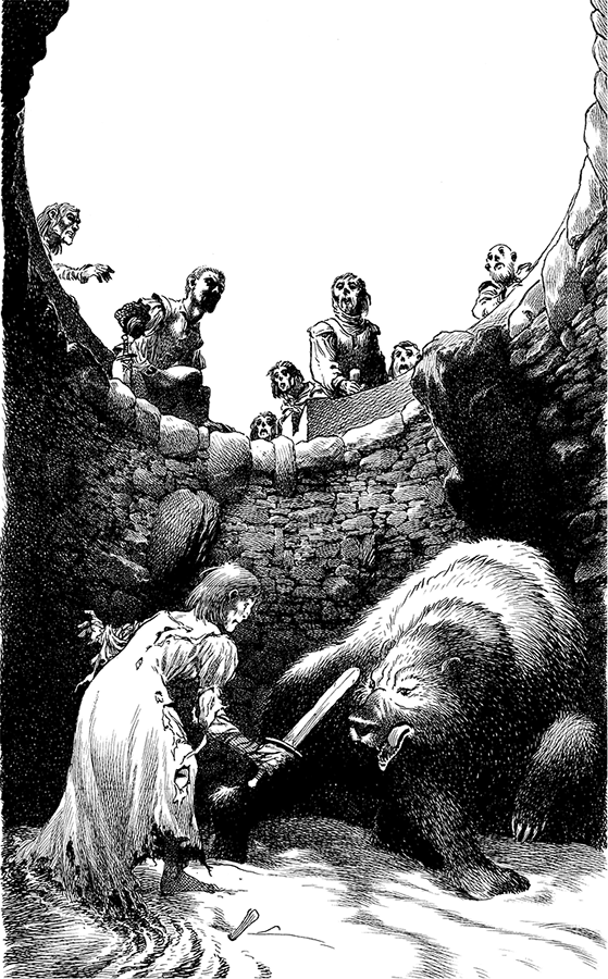 Король Харрен Черный даже медвежью травлю производил с размахом. Яма, десяти ярдов в поперечнике и пяти глубиной, была выложена камнем, посыпана песком и снабжена шестью ярусами мраморных сидений. Неуклюже соскочив с коня, Джейме увидел, что Бравые Ребята заполняют только четверть мест. Зрелище, на которое они смотрели, так захватило их, что прибытие Джейме заметили только те, кто сидел напротив.