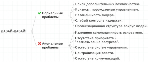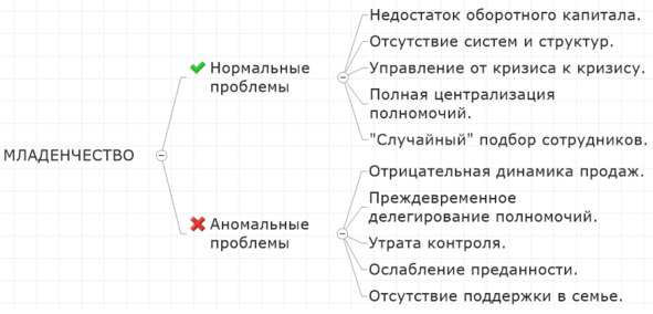 Проблемы – это не хорошо и не плохо. На каждом этапе развития компании учатся справляться с какими-то проблемами, которые являются характерными – нормальными – именно для него. Доктор Адизес на одной из своих лекций привел яркий пример: «Если ребенок писается по ночам, когда ему 2 года, это нормально. А вот если это продолжается, когда ему 22 года, это уже ненормально». Нормальные проблемы указывают на этап, на котором компания сейчас находится, и решать их нужно спокойно и системно. Если вовремя с ними не разобраться, на следующем этапе они станут аномальными, и «гомеопатия» уже не поможет, придется «Резать к чертовой матери!»