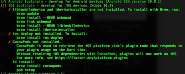 Если планируете собирать и тестировать под iOS, то необходимо установить и обновить Xcode и соответствующие пакеты с помощью brew, следуя подсказке в ответе flutter doctor, а также следовать инструкции для macos https://flutter.dev/docs/get-started/install/macos)