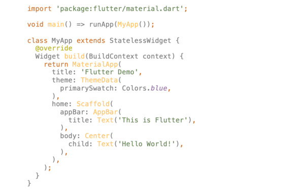 Рассмотрим код подробнее. Как уже говорилось выше, MyApp наследуется от StatelessWidget, это неизменяемый UI компонент-виджет. Вообще, все во Flutter – это виджеты, и приложение тоже. В виджете мы переопределяем метод build, в котором указывается, что и как отрисовать.