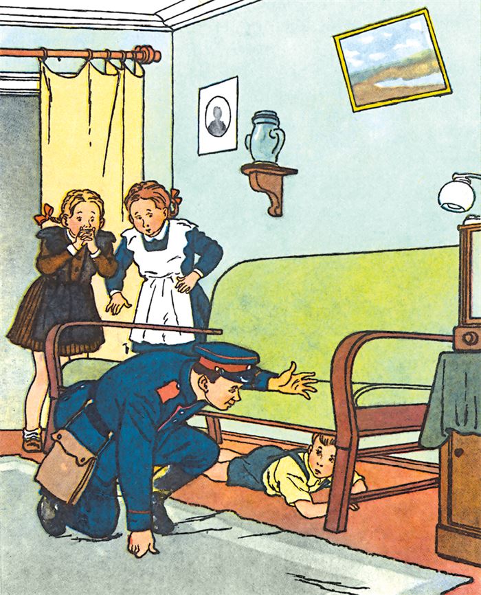 Марина и Ира вошли вместе с милиционером в комнату и увидели, что Сашка куда-то исчез. Марина даже заглянула под диван. Сашка увидел её и молча погрозил ей из-под дивана кулаком, чтобы она не выдавала его.