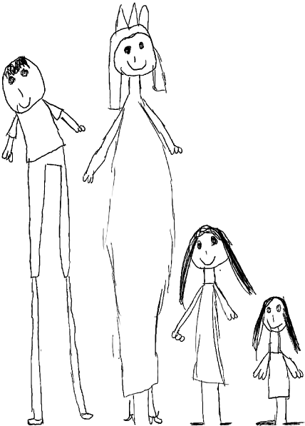 Малыш по моей просьбе нарисовал свою семью. Слева направо: пятимесячный брат, сам мальчик, мама, папа. Пациент хочет чувствовать себя самым младшим, даже пятимесячного брата он нарисовал больше себя. Или, возможно, он хочет напомнить, что он тоже маленький, и ему нужны тепло, забота, больше тактильных ощущений (ласковые прикосновения и объятья).