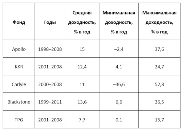 В качестве примеров крупнейших частных фондов отметим такие, как KKR – 206 млрд долл. под управлением, TPG – 111 млрд долл., Blackstone – 545 млрд долл., Apollo – 312 млрд долл., Carlyle – 223 млрд долл. (данные из отчетности фондов на середину 2019 г.). Очевидно, что финансовые институты, управляющие активами такого масштаба, играют чрезвычайно значимую роль в мировой экономике.