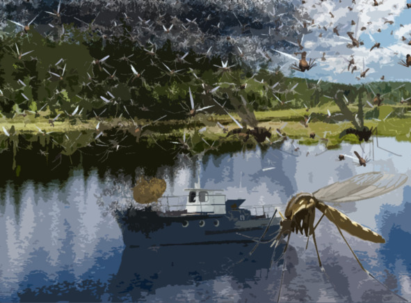 В небе, вокруг катера нарастал гул насекомых, Сергей поднял голову и увидел, что воздух со всех сторон посерел от тысячи комаров. Комары с невероятно пронзительным писком, врезались в руки, ноги, голову Сергея запутываясь в его волосах. Испугавшись, Сергей убежал в каюту к деду, где они вместе, закрыв плотно двери, наблюдали за происходящим вокруг, в относительной безопасности, через стёкла рубки катера.
