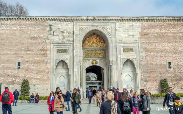 Раньше через Ворота Приветствия верхом на коне разрешалось проезжать только султану. Сейчас это главный вход для туристов, которые по билетам могут через них пройти в центральную часть дворца.