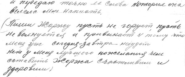 «Пиши Жоржу пусть не горует, пусть не волнуется и привикает к тому что меня уж сегодня-завтра небудет. Нет у меня лучшего пожелания чем оставить Жоржа счастливым и здоровым… Пиши говорит Жоржу пусть ни делает ничего что может причинить ущерб его учению, чтобы труды его не пропали даром, а меня уж он все одно не застанет».[190]