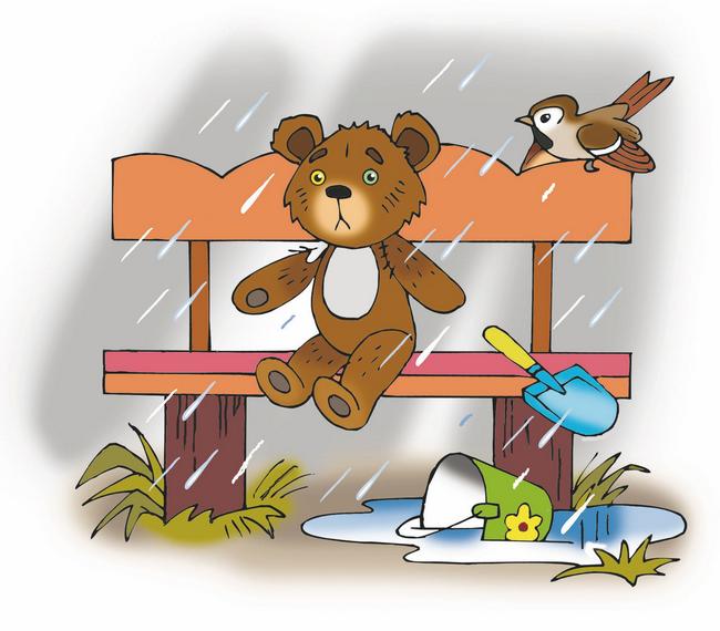 Вовка посадил мишку на мокрую скамейку и пошёл к папе, который ждал его на углу.
