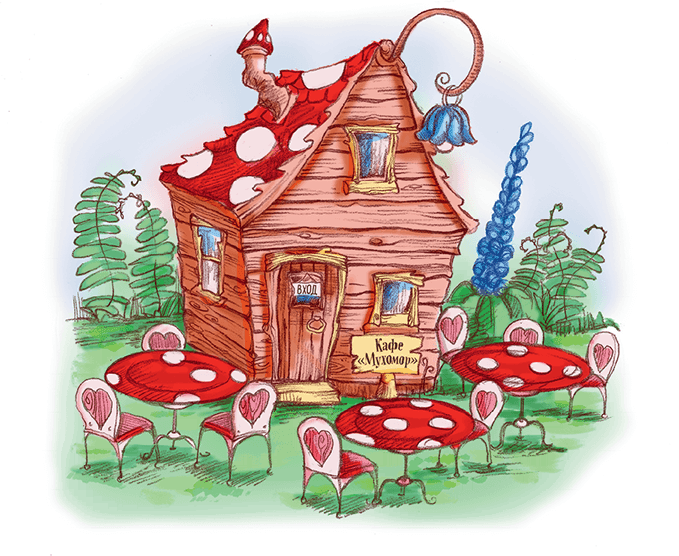 Подруги огляделись. Каково же было их удивление, когда на поляне вдруг стали появляться новые домики. Некоторые из них ютились между корнями деревьев, а один домик с покрытой мхом крышей наполовину скрывался в земле. Возле одного из строеньиц с крышей, покрытой белыми пятнами, стояли маленькие столы и стулья – в высоту они едва доставали девочкам до колен. Крохотная вывеска гласила: «Кафе “Мухомор”».