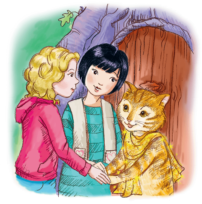Девочки попрощались с жителями леса, и Голди проводила их к красивому дереву с золотыми листьями недалеко от поляны. Кошка дотронулась лапой до дерева, и в стволе появилась небольшая дверца, похожая на ту, что подруги видели на Золотом лугу.