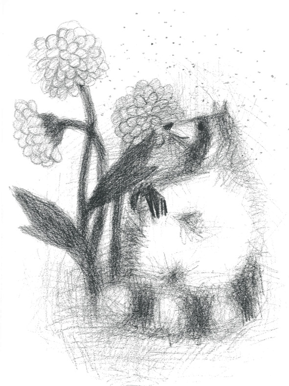 Но вдруг Енот остановился. Он был поражен, потому что увидел, что Георгина почти зачахла… ее так долго не поливали и так долго никто не приносил ей воды, что она стала сухая и увядающая. Енот заплакал.
