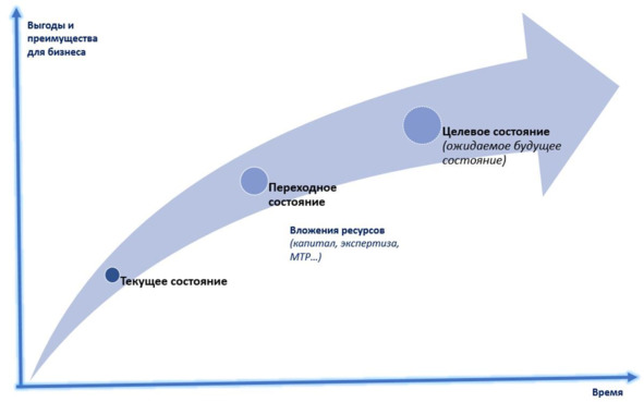 С точки зрения бизнеса цель проекта преобразования (даже если задача проекта ликвидация предприятий, закрытие линии бизнеса или выход из него, отказ от определенных сегментов клиентов и т.д.) – это переход из текущего состояния в некое целевое состояние (ожидаемое в новой будущей реальности) так, чтобы получить существенные преимущества и выгоды.