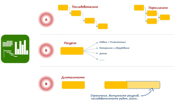 в) Длительность (с учетом организационных особенностей и ограничений, сроков доступности ресурсов и последовательности работ, а также люфты на риски и непредвиденные последствия)