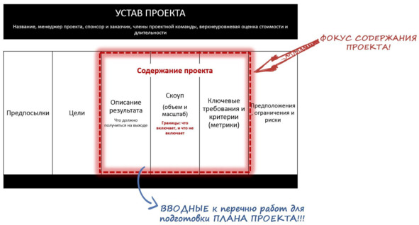 Задача этого документа – более детально описать что входит в проект и из чего он состоит. Это расширение устава проекта в части его объема и границ (не забываем, что явно не входит в проект также необходимо учесть), работ и промежуточных результатов. В общем все то, что необходимо сделать, чтобы достичь целей/получить результат проекта.