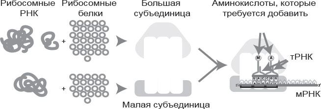 К тому моменту, как я стал работать у Питера, уже были установлены некоторые базовые факты о рибосомах. Каждая рибосома состоит из двух частей: большой и малой субъединиц. Малая субъединица связывается с мРНК, содержащей генетическую информацию, а большая сшивает аминокислоты, подносимые тРНК, и делает из них белок. В рибосоме есть пазы для трех тРНК, одна из которых подносит новую аминокислоту, другая – удерживает растущую белковую цепочку, а третья – выступает в качестве своеобразной перевалочной базы, куда белки попадают перед выходом из рибосомы. И тРНК движутся по рибосоме от одного паза к следующему. В сущности, они протаскивают мРНК вслед за собой, и сама рибосома фактически движется вдоль мРНК, помогая тРНК считывать кодон за кодоном при синтезе белка. Прохождение каждого этапа требует энергии, поэтому рибосому часто называют молекулярной машиной, или наномашиной.