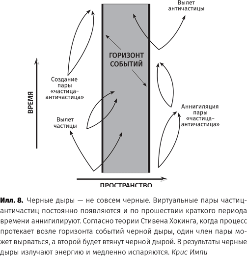 Предложенное Хокингом решение этого противоречия ошеломило мир теоретической физики. Он заявил, что черные дыры испаряются. Вот как это происходит. В классической физике космический вакуум пуст, но, согласно квантовой теории, в нем постоянно возникают и уничтожаются «виртуальные частицы». Они существуют ничтожно малые промежутки времени, разрешенные принципом неопределенности Гейзенберга. В нормальных условиях эти пары частиц и античастиц или пары фотонов исчезают, ни на что не влияя, однако вблизи горизонта событий черной дыры мощная гравитация может разъединить виртуальные пары. Одна часть падает в дыру, а другая улетает прочь и становится реальной – так черная дыра излучает энергию (илл. 8). Источником энергии, необходимой для создания реальной частицы, является гравитационное поле черной дыры, вследствие чего ее масса уменьшается. Шутливо опровергая знаменитую остроту Эйнштейна о квантовой механике «Бог не играет с Вселенной в кости», Хокинг заявил: «Бог не только играет в кости, но иногда бросает их туда, где их невозможно увидеть»[41].
