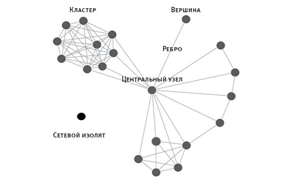 Илл. 6. Фундаментальные понятия теории сетей. Каждая точка на графике – это вершина, или узел, каждая линия – грань. Точка, названная центральным узлом, имеет наибольшую центральность по степени и центральность по посредничеству. Вершины, названные кластером, имеют более высокую плотность, или коэффициент местной кластеризации, чем другие участки графика.