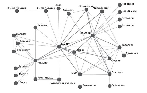 Илл. 7. Простая (но трагическая) сеть: “Гамлет” Шекспира. Гамлет лидирует с точки зрения центральности по степени (16 связей по сравнению с 13 связями Клавдия). “Зона смерти” в пьесе охватывает персонажей, связанных одновременно с Гамлетом и Клавдием. (См. фото.)