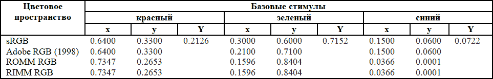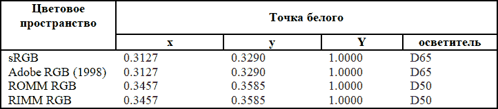 В заключение приведем таблицу, содержащую значения некоторых параметров модели RGB для перечисленных выше цветовых пространств. В таблице даны значения координат CIEXYZ, пересчитанные по формулам x=X/(X+Y+Z), y=Y/(X+Y+Z).