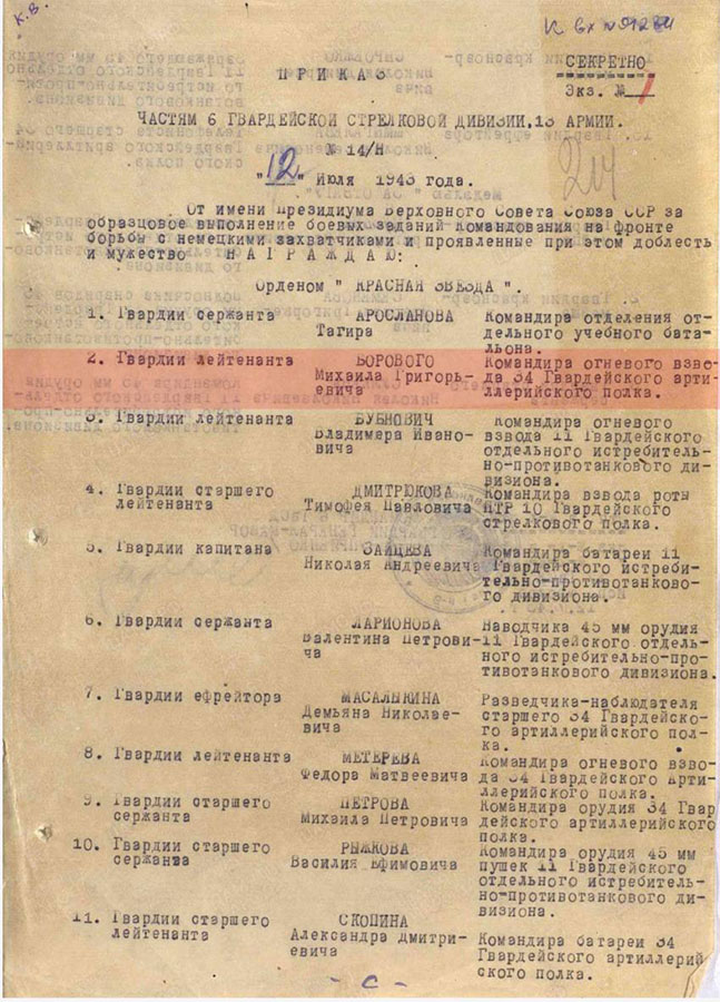Ваше представление на гвардии лейтенанта Борового было рассмотрено, но поскольку гв. л-т Боровой на момент совершения подвига не является членом ВКПб[29], то командование сочло необходимым понизить награду до ордена Красного Знамени и рекомендовать тов. Боровому вступить в ряды членов ВКПб.